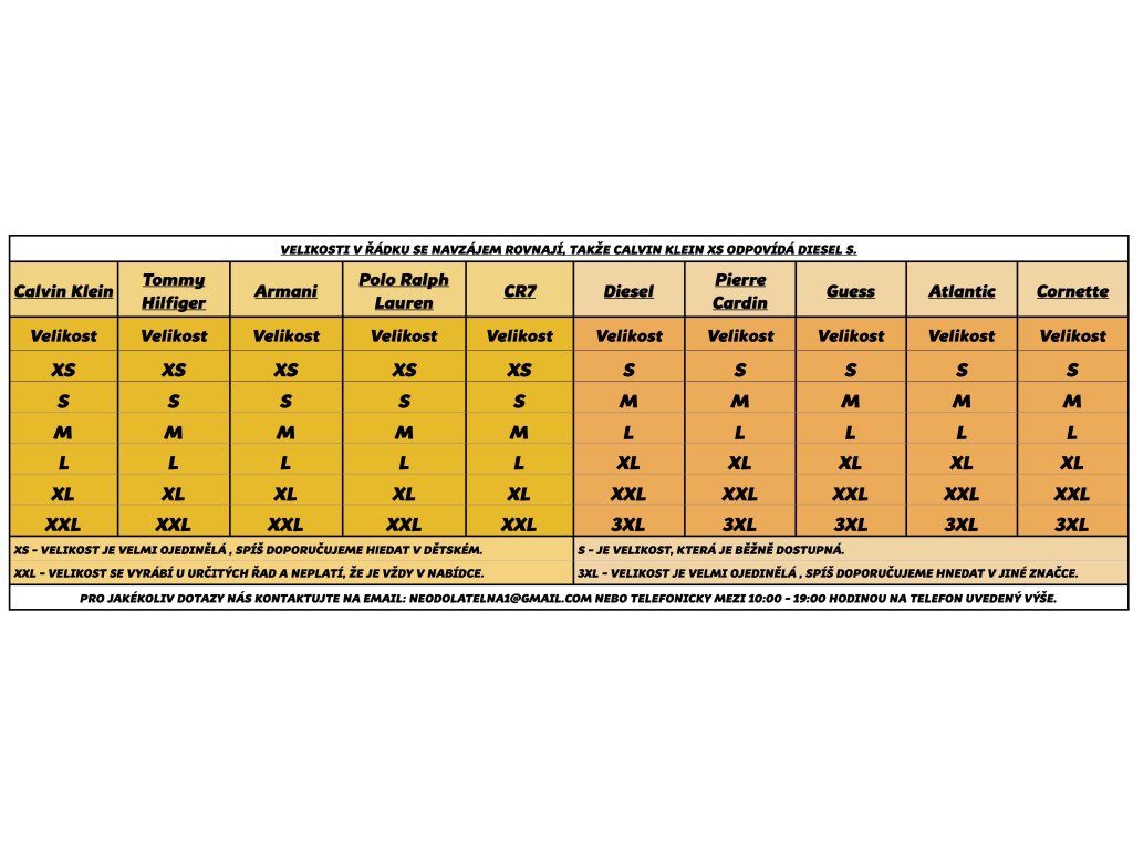 - Aby jsme vám nákup ulehčili, najdete mezi fotkama 2 tabulky, které vám s výběrem velikosti pomůžou . 1. je šířka gumy v cm. 2. je velikostní porovnání všech značek od kterých máme v boxerky v nabídce. Doufáme, že je vše srozumitejné a že vám to pomůže, při výběru produktu. Pokud ne kontaktujte nás na email.